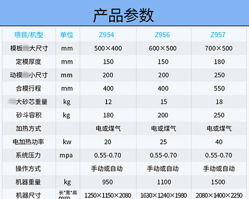 其实,坤泰的全自动射芯机的型号主要是从射芯机的尺寸大小来判断的,像它们的模板尺寸、定模厚度、合模行程、砂芯重量、砂斗容积、功率、压力等都会不一样,954的尺寸、功率这些就会比957的要小。