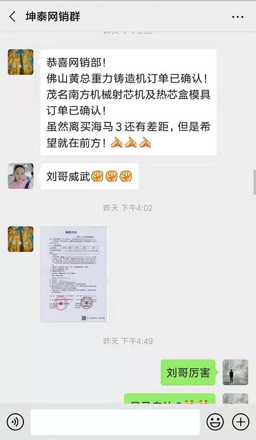 这两天坤泰的网销部先后得到了好几个好消息,不仅仅每天的询盘在稳定增加,更是成交了两个网销大订单。两个都是广东来的网销客户,一个成交的是坤泰的铝合金重力铸造机,另一个成交的是3套砂芯盒模具和一台全自动上砂射芯机。两个网销订单的成交,也使得坤泰的员工们信心增加了,坤泰的努力没有白费!